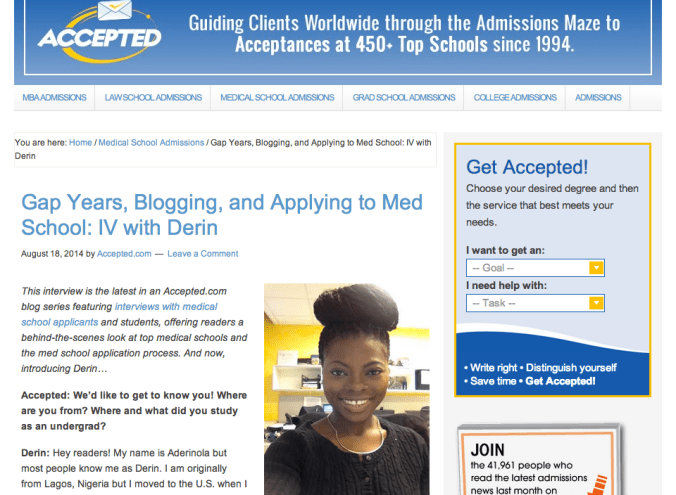 Blogging is turning out to be a really interesting experience, I embrace it all. I was recently interviewed by Accepted.com, an admissions consultancy. Although I am not utilizing any consulting services for my application process, their website does have useful tips and advice to guide applicants. In my interview, I discuss my premed journey, my gap year, my current medical school application cycle, and my lovely blog. I also offer some advice – please learn from my mistakes! Do check out the interview HERE