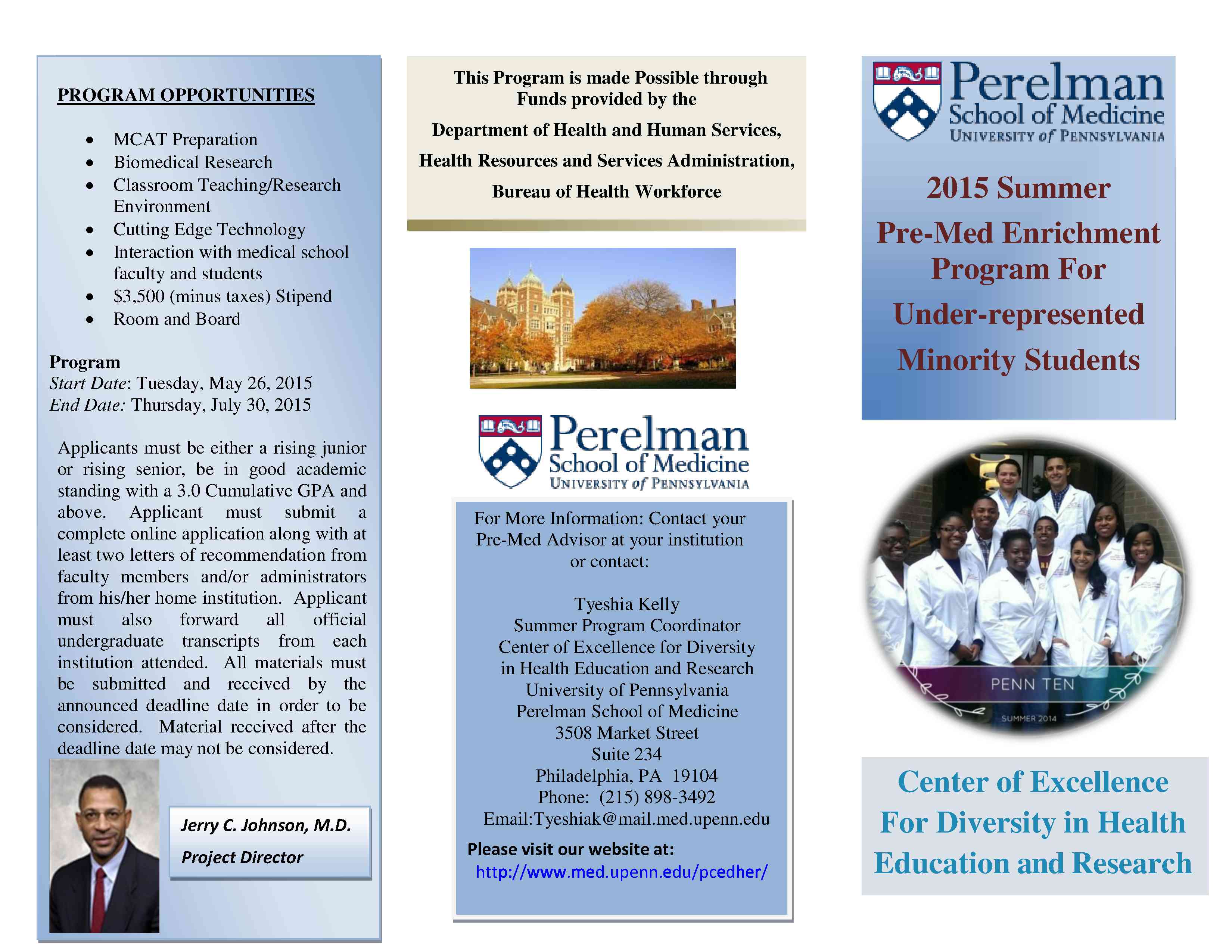 The Center of Excellence for Diversity in Health Education and Research of the University of Pennsylvania, Perelman School of Medicine is now accepting applications for the 2015 Summer Pre-Med Enrichment Program for Under-represented Minority Students (for undergraduate students).